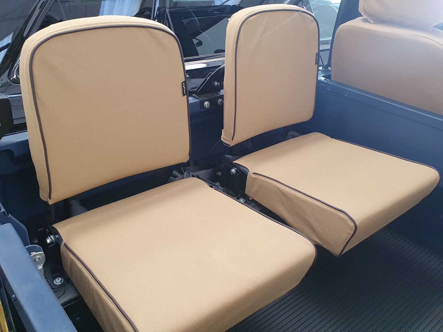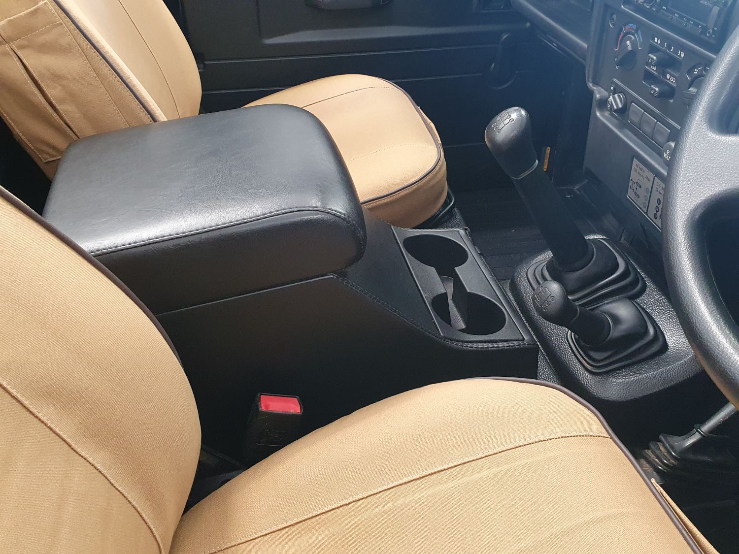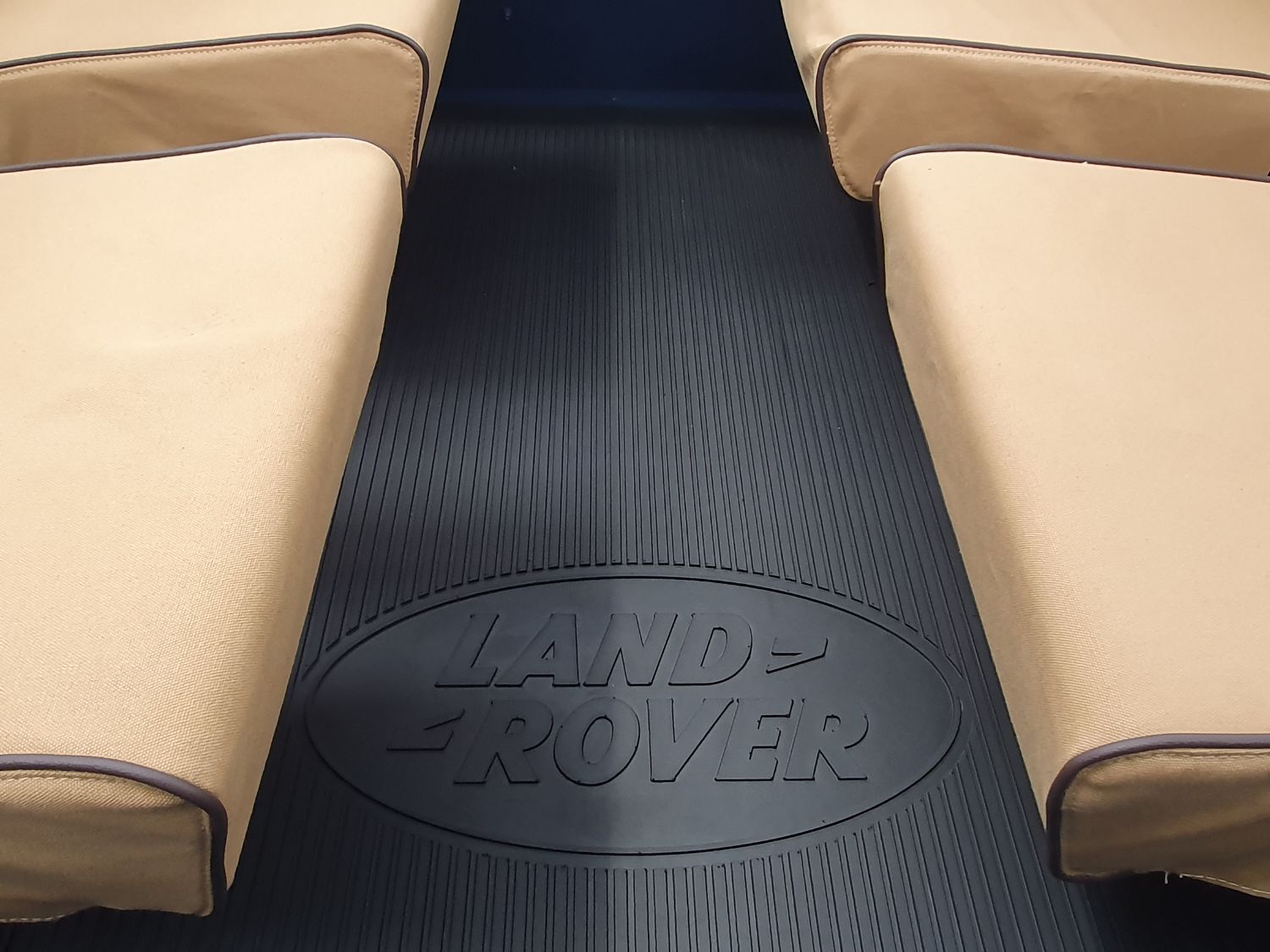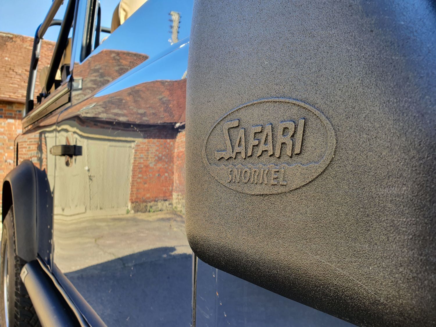 Modifications to the rear include a super strong Exmoor Trim internal safety roll cage in satin black covered with a full length sand hood featuring side and rear roll-up windows. All four rear passenger seats are foldable with sand seat covers and static lap belts, all supplied through Exmoor. The flooring is covered in a genuine Land Rover rubber mat for protection and sound deadening.