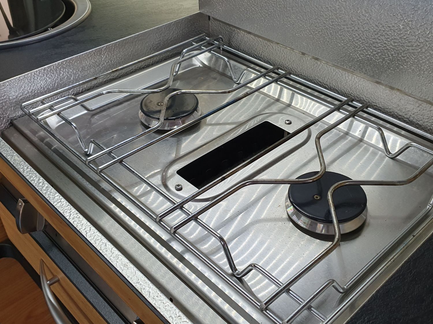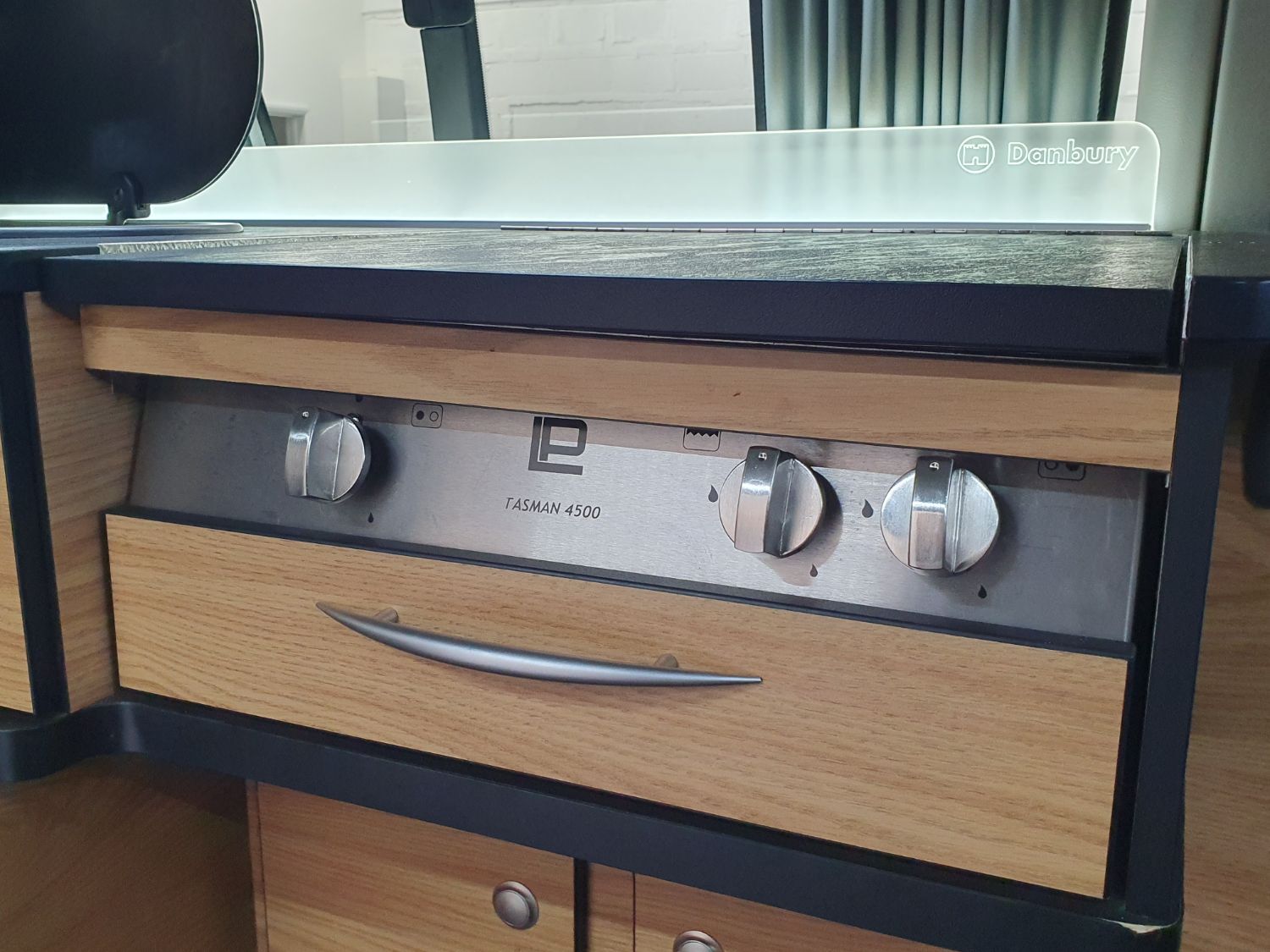 The kitchen area features a fridge and freezer neatly behind a roller door, pull out kitchen work surface extention under the sink, LED lighting in the food prep area including backlit Danbury work surface finished. 25 litre water tank, 2 gas burners and gas grill with new gas bottle.